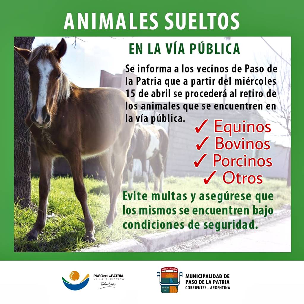 La Municipalidad de Paso de la Patria recuerda a los vecinos que se procederá al retiro de los animales que deambulen en la vía pública.