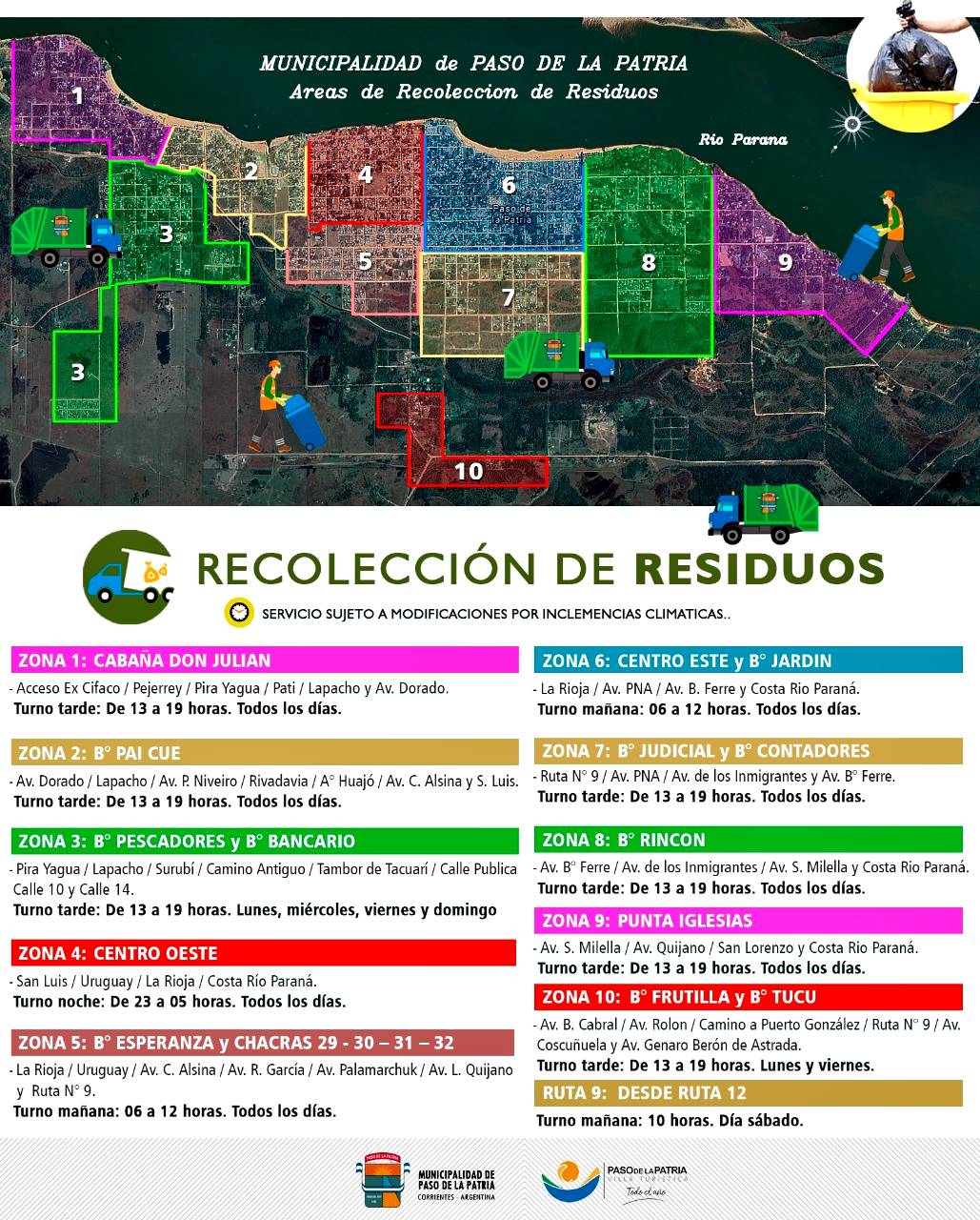 Entre los servicios de higiene urbana que están a cargo de la Municipalidad de la Ciudad de Paso de la Patria se encuentra la recolección domiciliaria de los residuos.