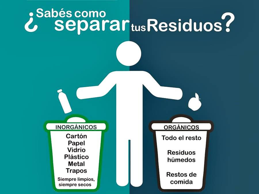 Se recomienda la separación de residuos en origen. Residuos secos o inorgánicos en una bolsa y en otra residuos húmedos u orgánicos.