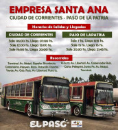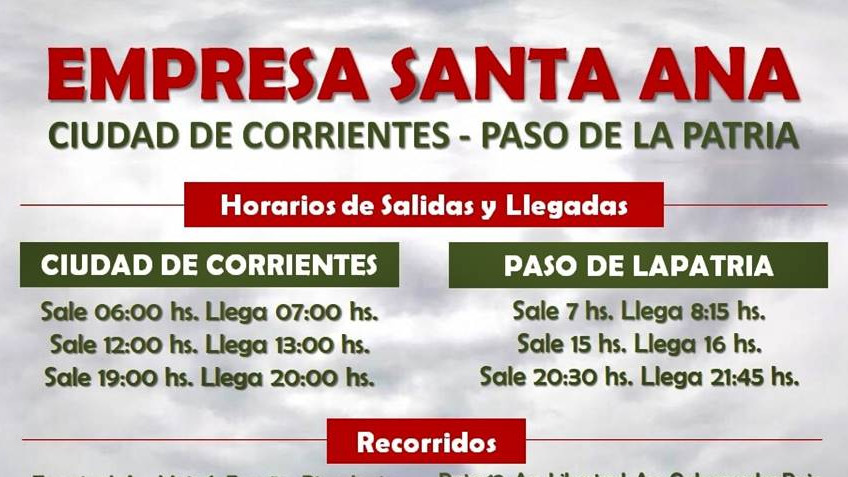 El servicio iniciará el próximo lunes 26 de abril, incluirá 6 viajes diarios (de lunes a sábado) y el pasaje costará $200 (doscientos pesos). Empresa “Santa Ana” (Línea 11), original de Paso de la Patria desde 1935.