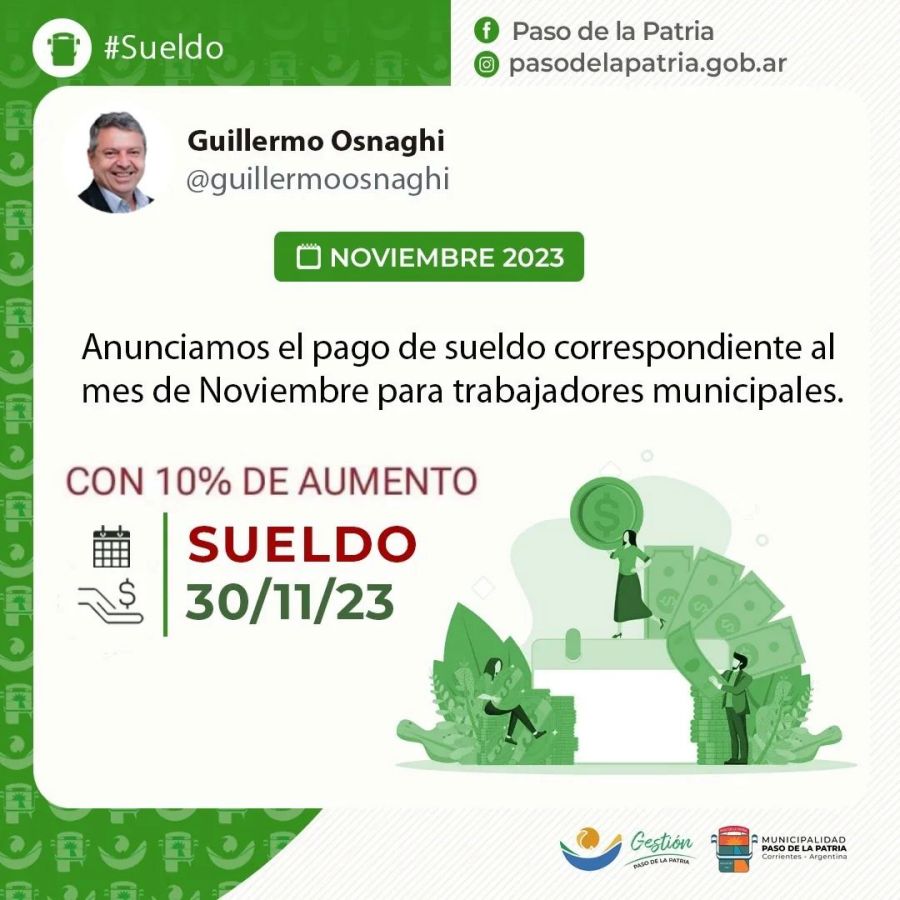 El Arq. Guillermo Osnaghi, Intendente de la Municipalidad de Paso de la Patria, dio a conocer la fecha de pago de los sueldos correspondientes al mes de noviembre de 2023 para todos los trabajadores municipales.