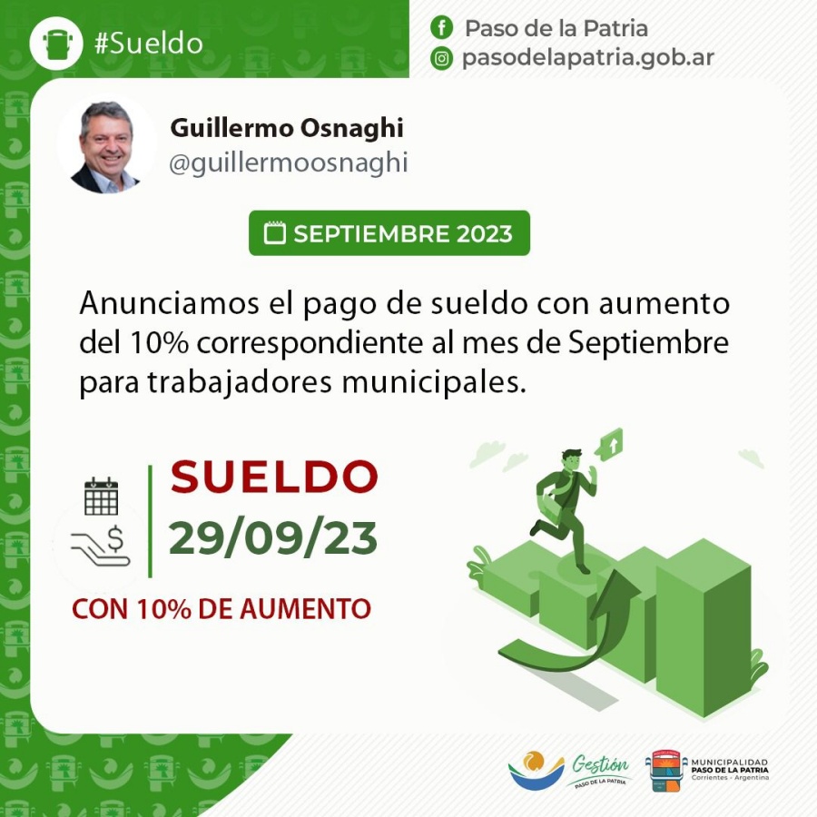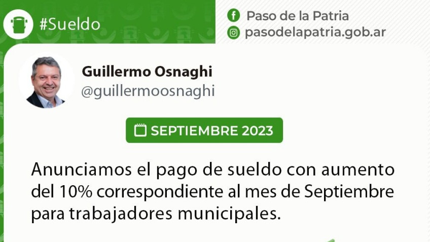 El Arq. Guillermo Osnaghi, Intendente de la Municipalidad de Paso de la Patria, anunció el pago de los sueldos correspondientes al mes de septiembre de 2023 para los trabajadores municipales.