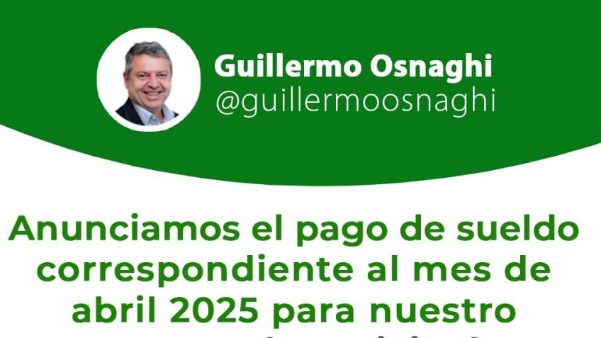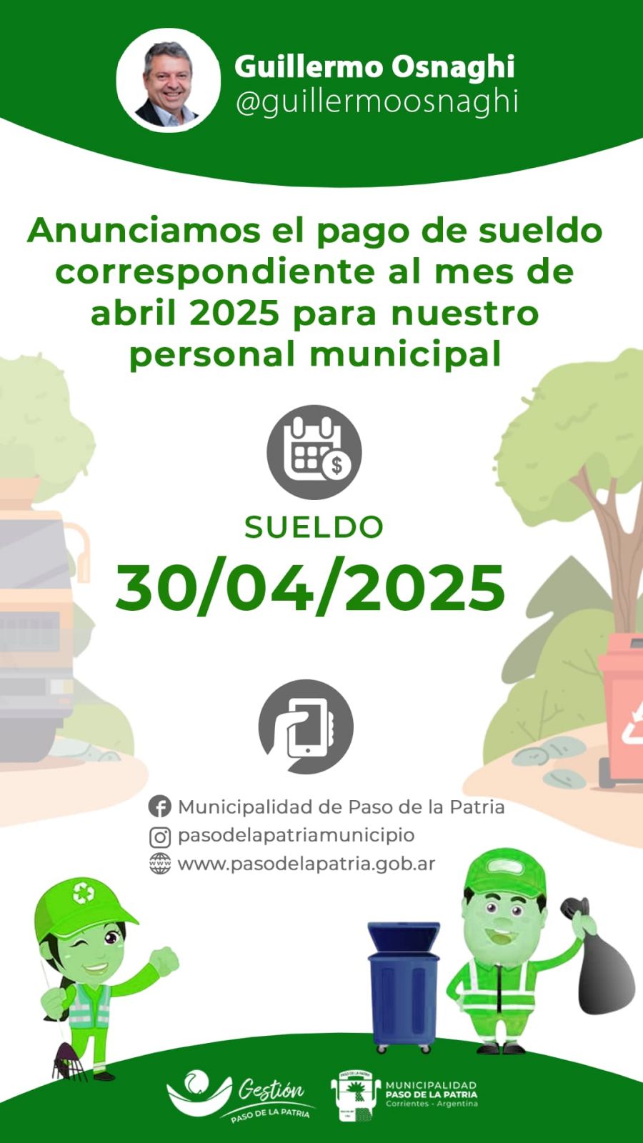 El Arq. Guillermo Osnaghi, Intendente de la Municipalidad de Paso de la Patria, anuncia la fecha de pago de los sueldos de abril de 2025 para los trabajadores municipales.