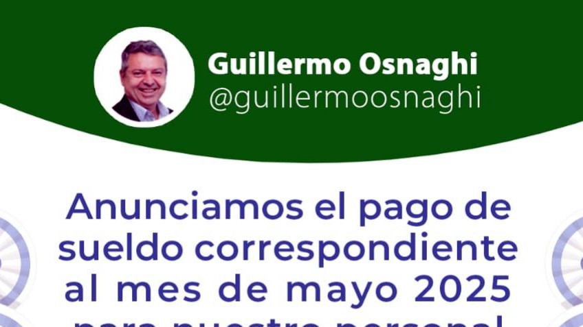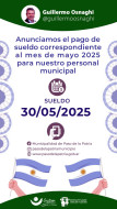 El intendente de Paso de la Patria, Arq. Guillermo Osnaghi, anunció la fecha de pago de los sueldos correspondientes a mayo de 2025 para los empleados municipales.