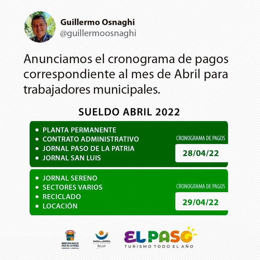 El intendente de la Municipalidad de Paso de la Patria, Guillermo Osnaghi, anunció el pago de sueldos correspondientes al mes de abril de 2022.
