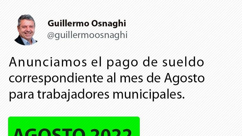 Siguiendo instrucciones del Intendente Guillermo Osnaghi, la Secretaría de Hacienda y Finanzas, informa el cronograma de pagos a los trabajadores municipales, correspondiente al mes de agosto de 2022.