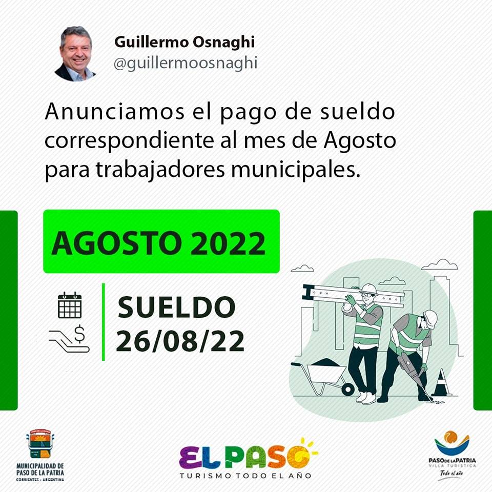 El intendente de la Municipalidad de Paso de la Patria, Guillermo Osnaghi, anuncia el pago de sueldos correspondientes al mes de agosto de 2022.