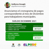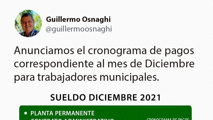 Siguiendo instrucciones del Intendente Guillermo Osnaghi, la Secretaría de Hacienda y Finanzas, informa el cronograma de pagos a los trabajadores municipales, correspondiente al mes de diciembre de 2021.