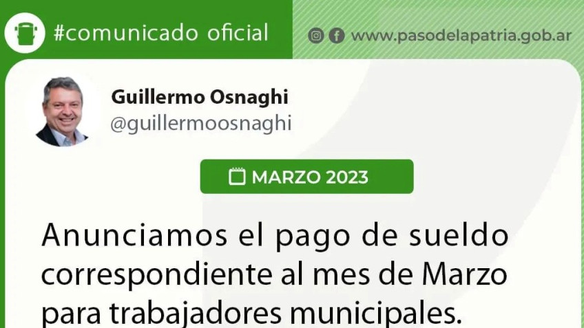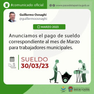El intendente de la Municipalidad de Paso de la Patria, Arq. Guillermo Osnaghi, anuncia el pago de sueldos correspondientes al mes de marzo de 2023.