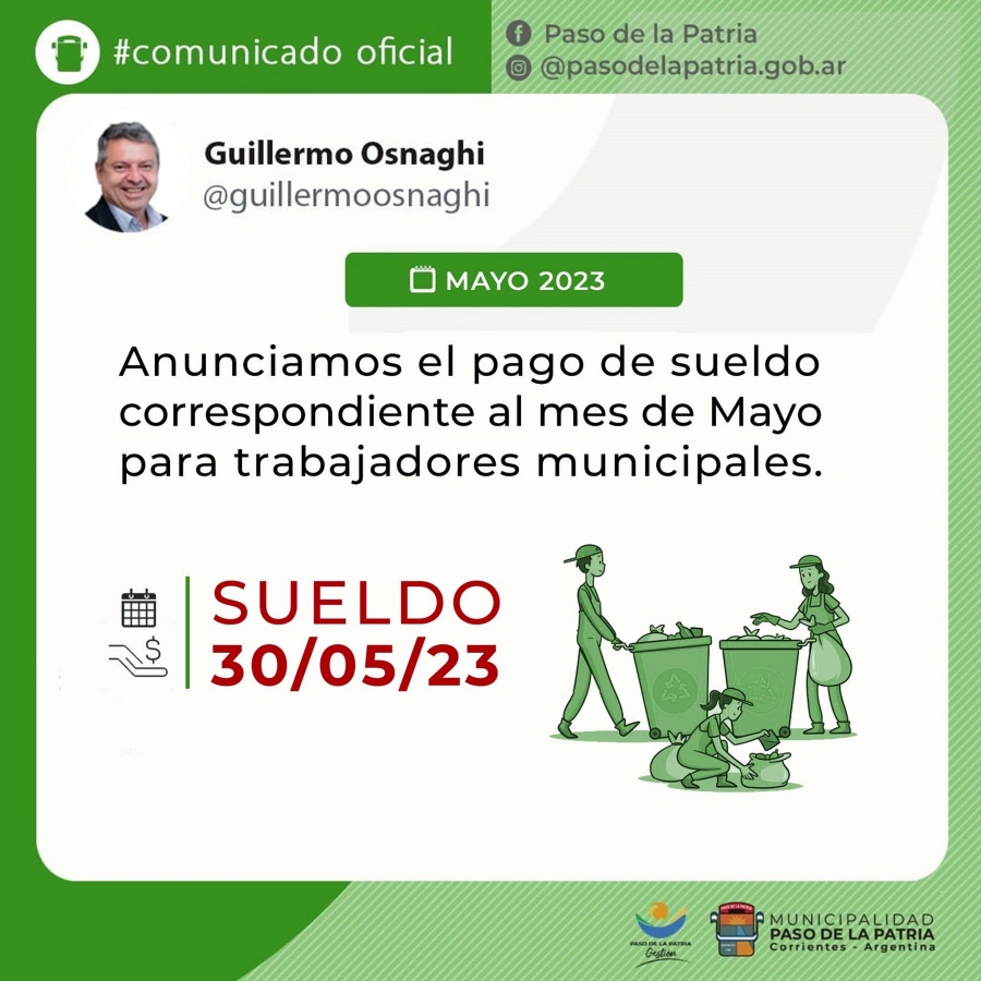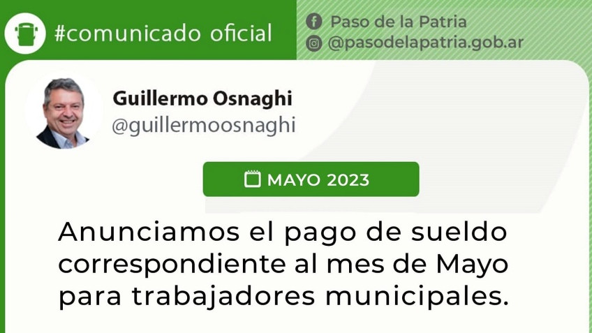 El intendente de la Municipalidad de Paso de la Patria, Arq. Guillermo Osnaghi, anuncia el pago de sueldos correspondientes al mes de mayo de 2023.