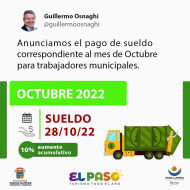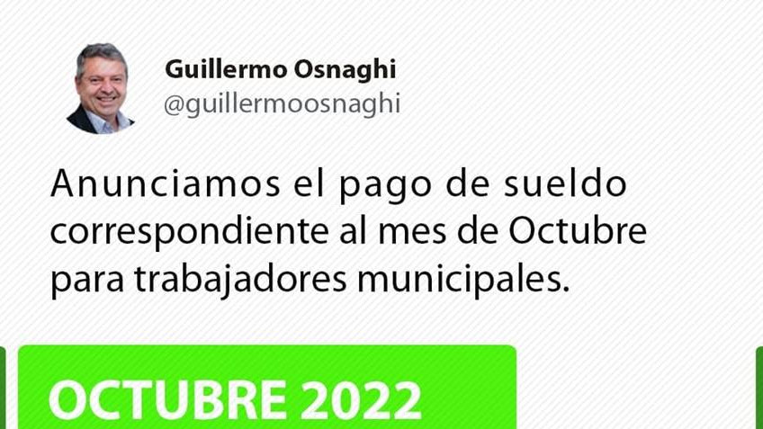 Siguiendo instrucciones del Intendente Guillermo Osnaghi, la Secretaría de Hacienda y Finanzas, informa el cronograma de pagos a los trabajadores municipales, correspondiente al mes de octubre de 2022.