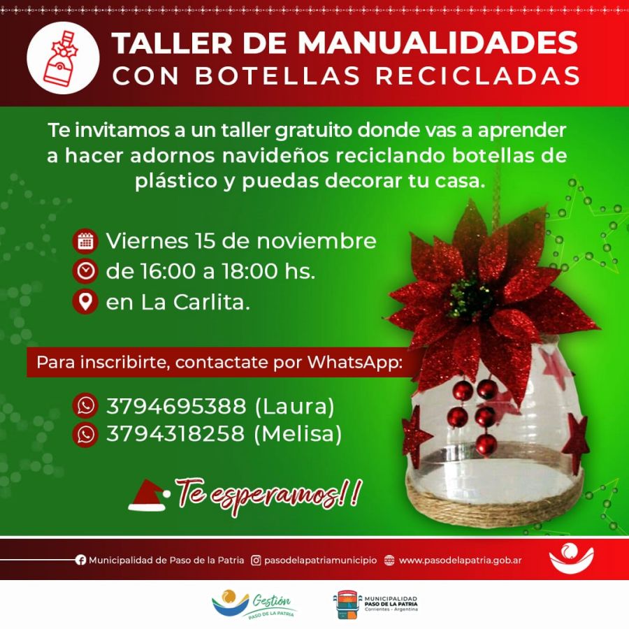 La Municipalidad de Paso de la Patria, a través del Departamento de Producción y Medio Ambiente, invita a la comunidad a participar en un taller gratuito de manualidades. En este taller, aprenderemos a crear decorativos navideños utilizando botellas de plástico recicladas (PET).