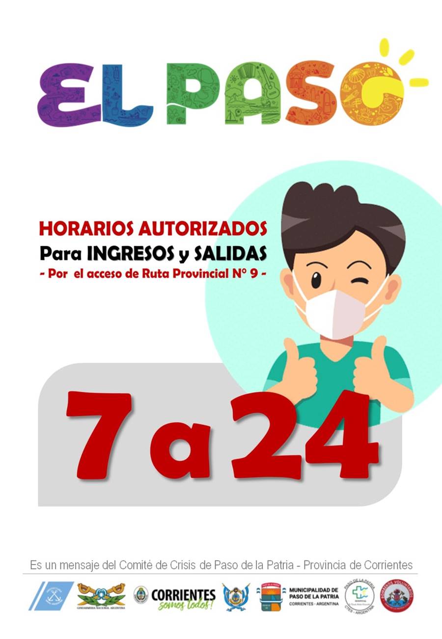 - Los horarios autorizados para entrar y salir de Paso de la Patria son de 7 a 24, todos los días, por el acceso principal de Ruta Provincial N° 9 (RP9).