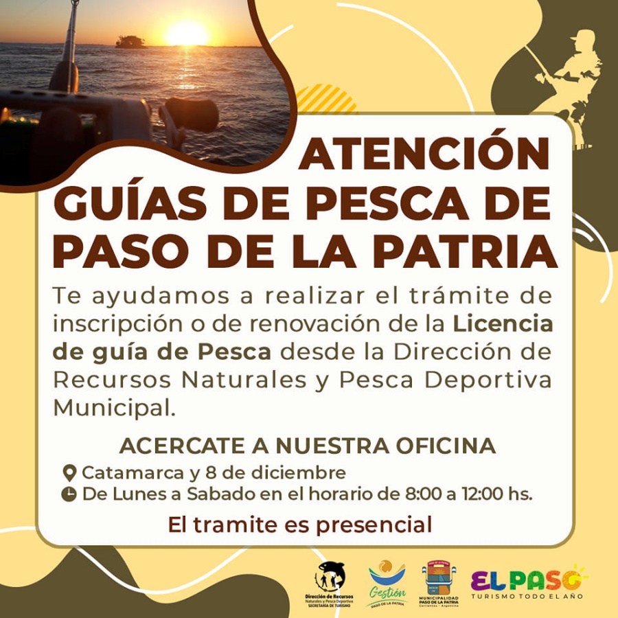 La Municipalidad de Paso de la Patria brinda información útil para ayudar a los guías de pesca a realizar el trámite de inscripción o renovación de su Licencia de Guía de Pesca.