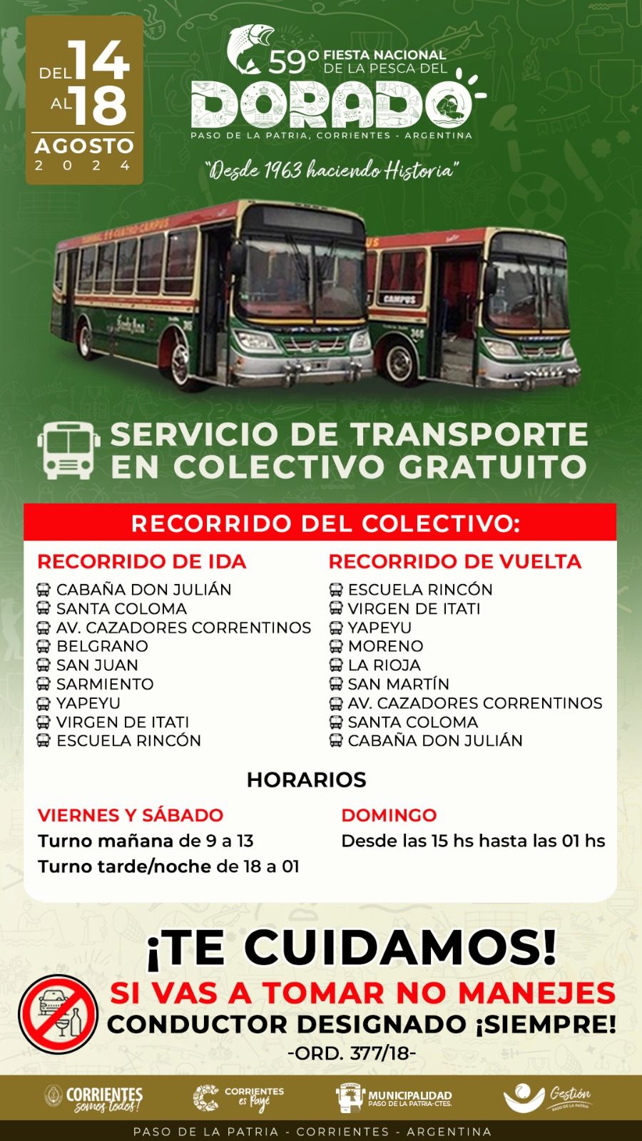 La Municipalidad de Paso de la Patria, por disposición del intendente Guillermo Osnaghi, ofrece un servicio de transporte público en Paso de la Patria, completamente gratuito, para que todos puedan disfrutar de la 59° Fiesta Nacional de la Pesca del Dorado.