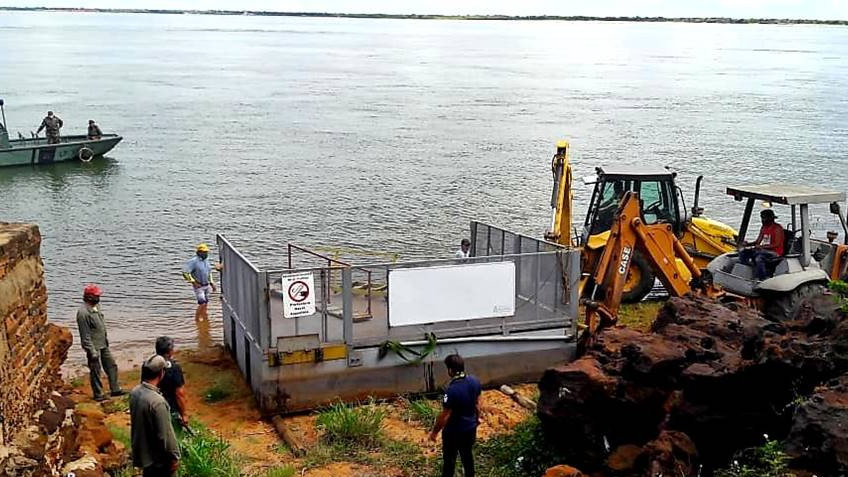 Trasladan pontón flotante en el puerto fronterizo de Paso de la Patria