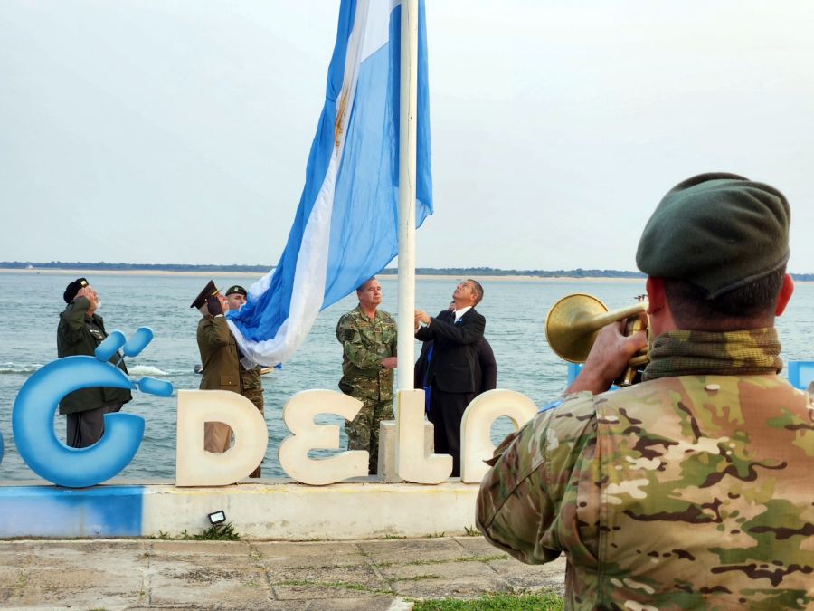 El intendente Guillermo Osnaghi, acompañado por el coronel Osvaldo Roque Díaz Colodrero y la docente Evangelina Ramírez izaron el Pabellón Nacional en honor al prócer.