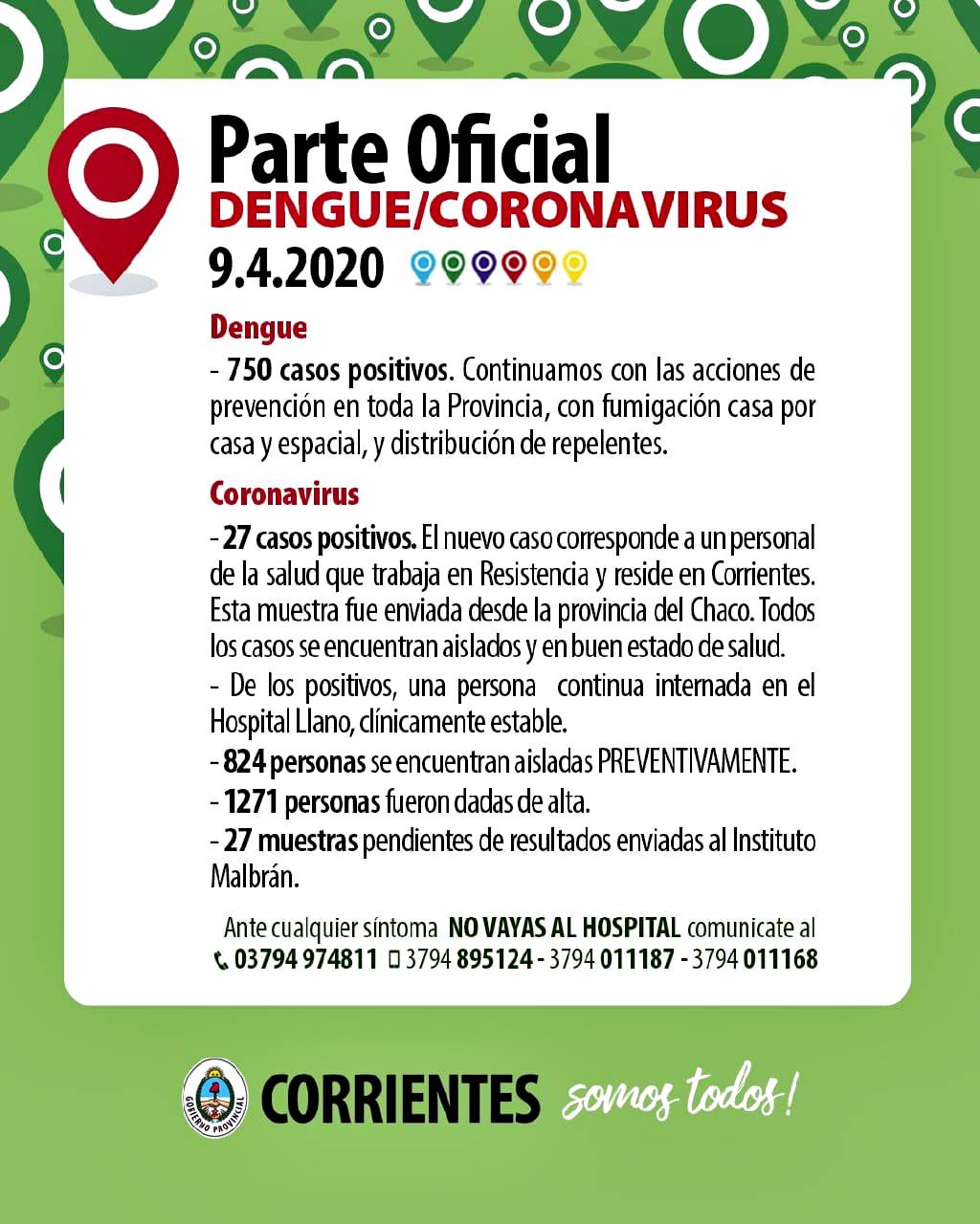 Un nuevo caso positivo, la muestra fue tomada en el Chaco a una trabajadora de la salud de esa provincia que tiene domicilio en la ciudad de Corrientes, se encuentra aislada y su condición clínica es estable. De esta manera se acumulan 27 casos positivos.