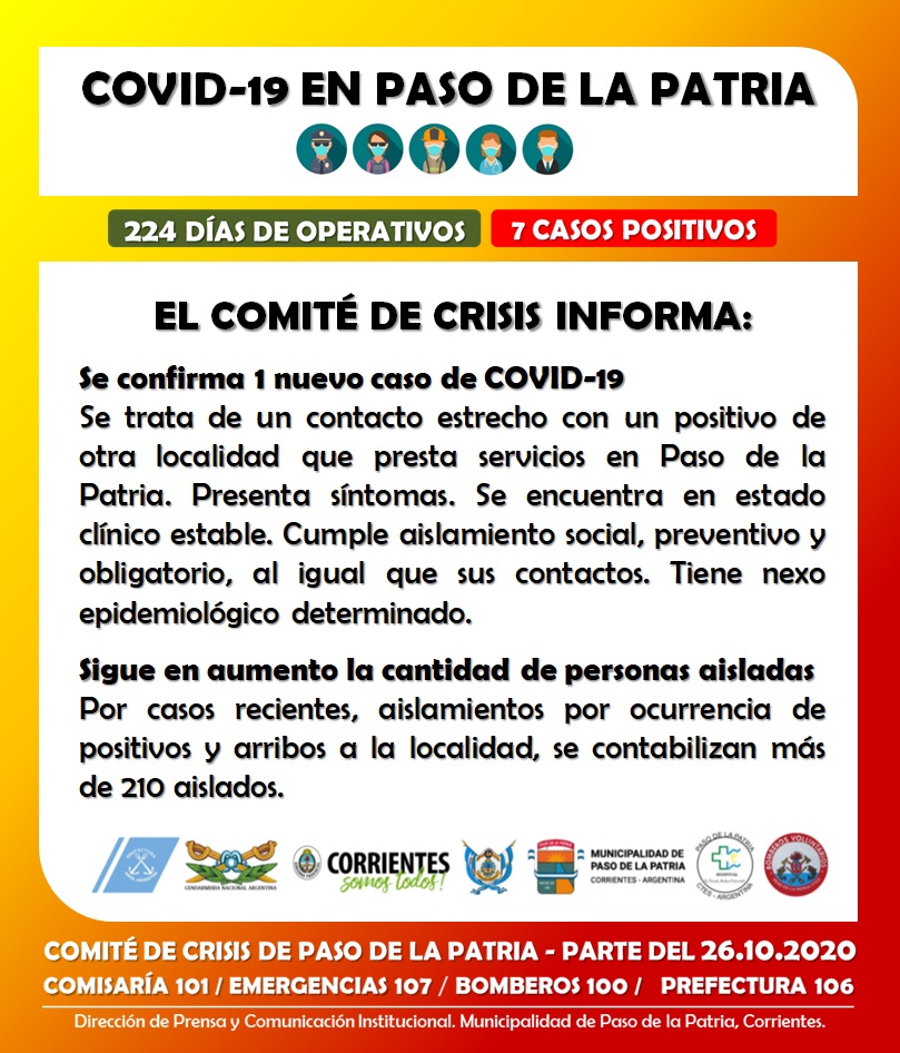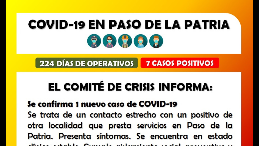 El Comité de Crisis de Paso de la Patria informa que en el día de la fecha se confirmó un nuevo caso de COVID-19, sumando 7 positivos en total para la localidad. Se estudian otros casos sospechosos.