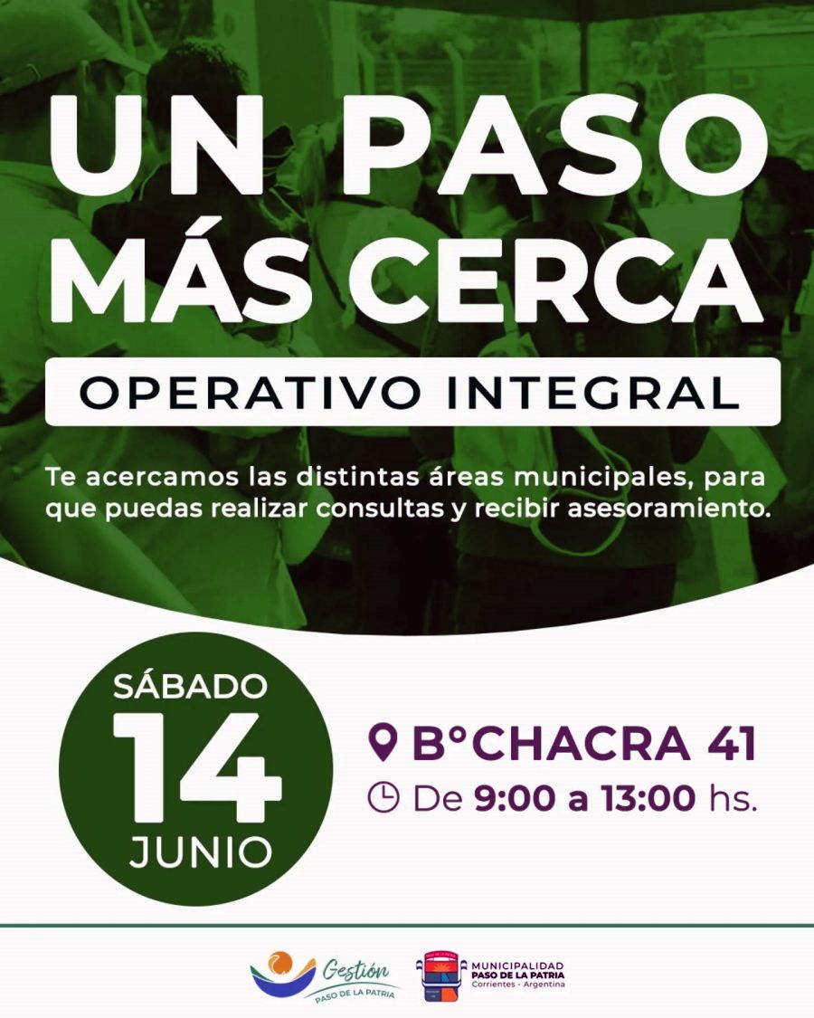La Municipalidad de Paso de la Patria llevará a cabo un importante Operativo Integral en el Barrio Chacra 41, ubicado en la intersección de la Avenida Navajas Artaza y la Ruta Provincial 98.