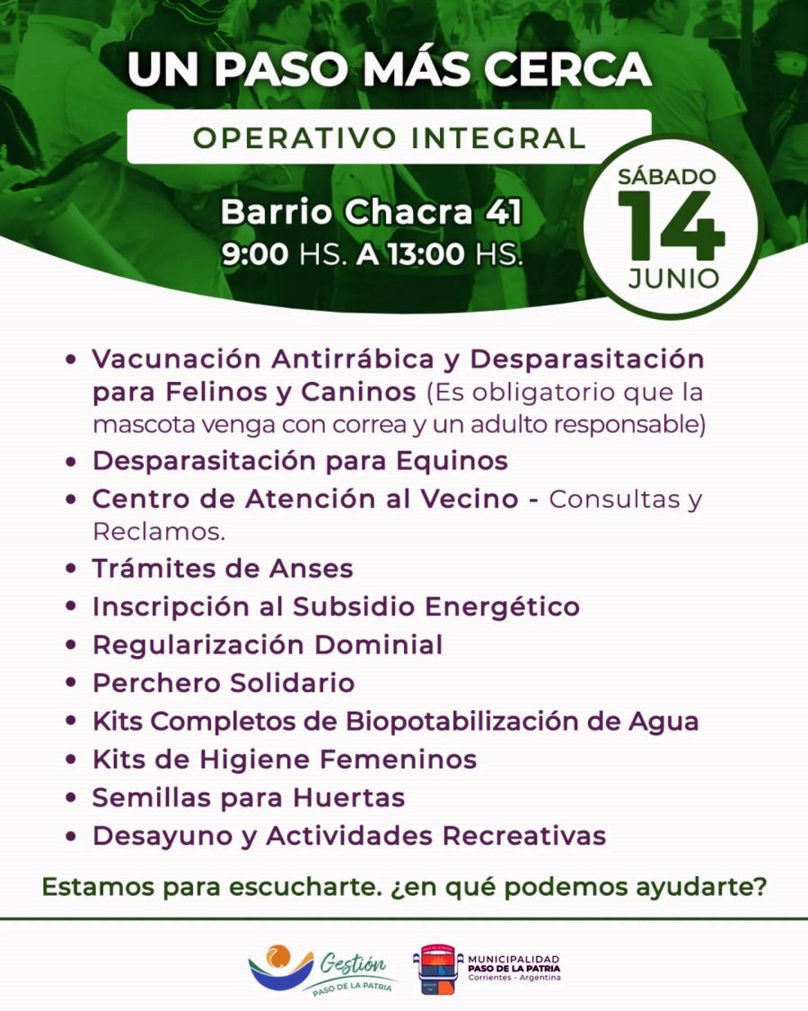 La Municipalidad de Paso de la Patria invita a todos los habitantes del Barrio Chacra 41 a participar de esta jornada llena de oportunidades y servicios esenciales. ¡No te lo pierdas!