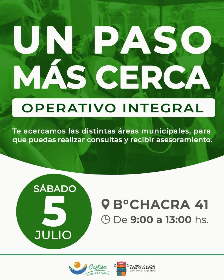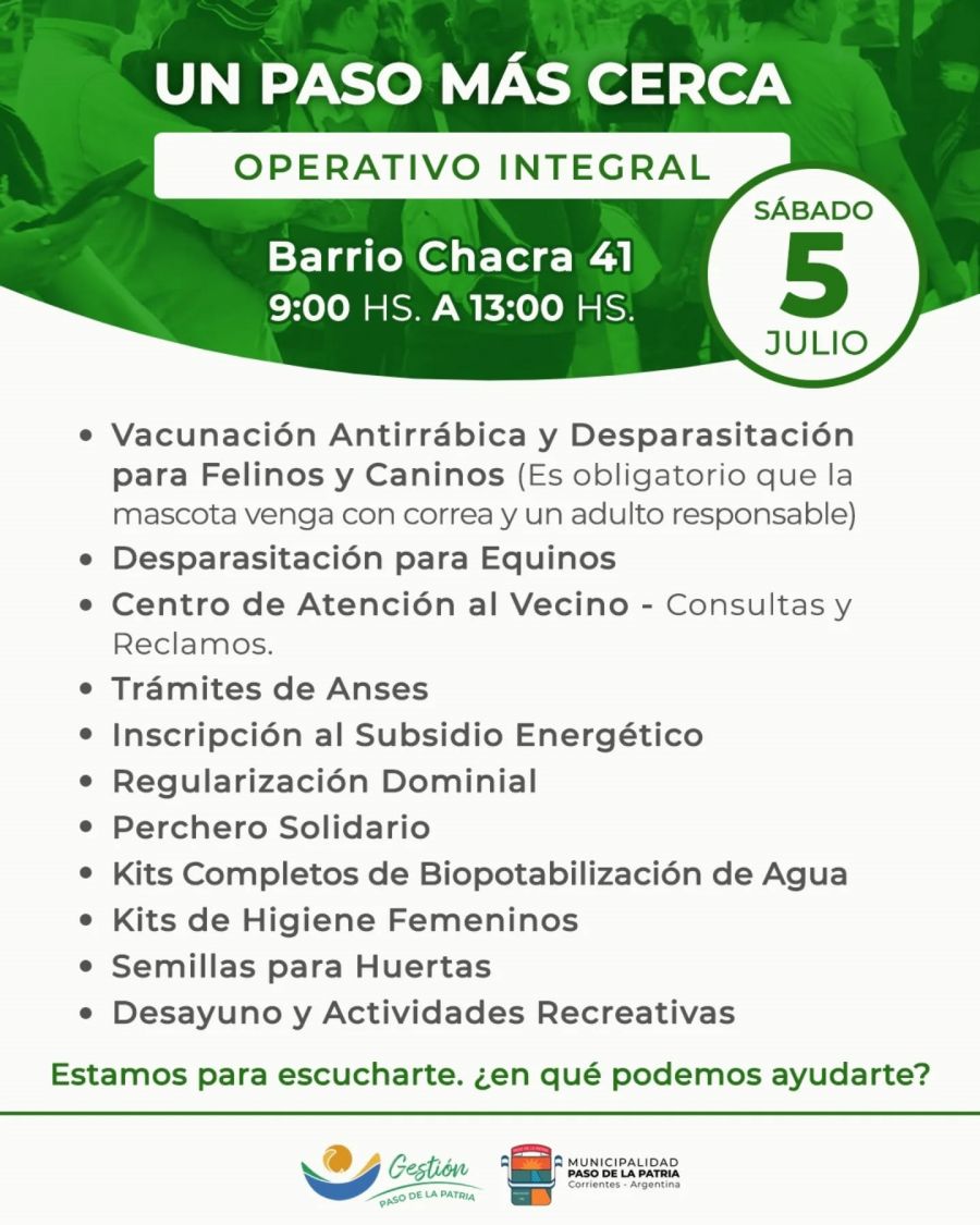 La Municipalidad de Paso de la Patria invita a todos los habitantes del Barrio Chacra 41 a participar de esta jornada llena de oportunidades y servicios esenciales. ¡No te lo pierdas!